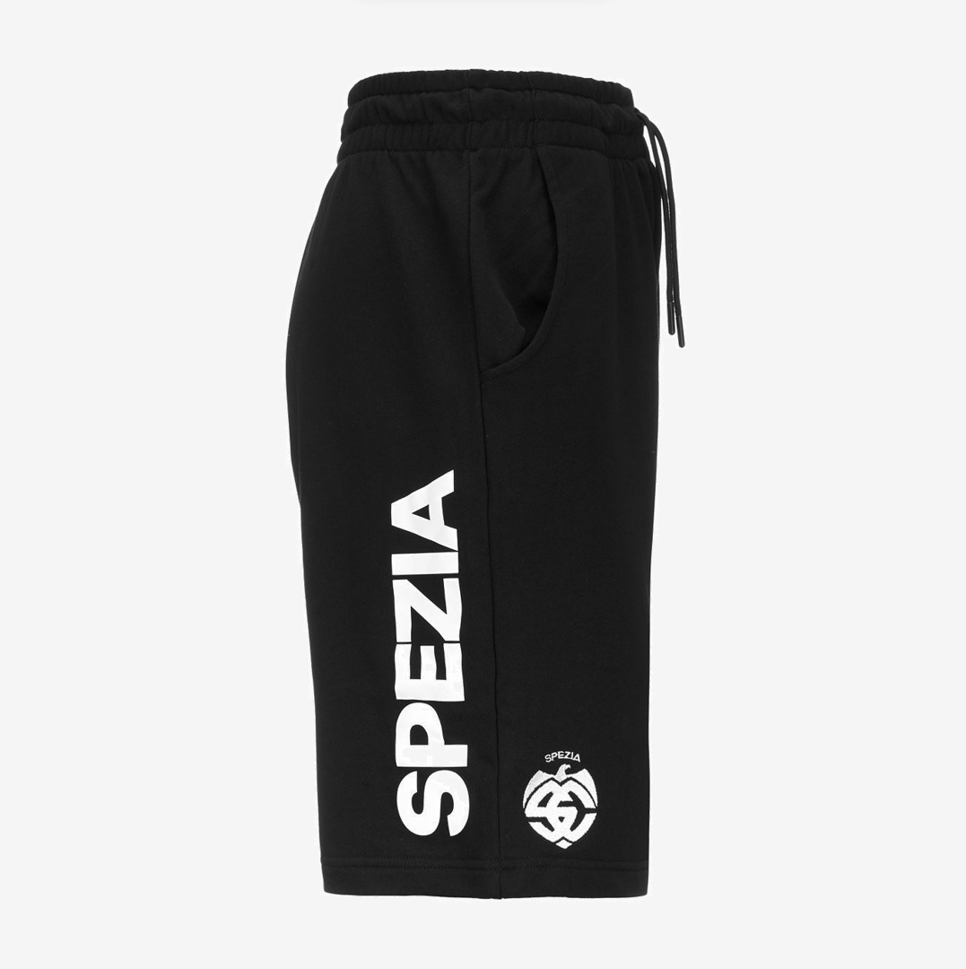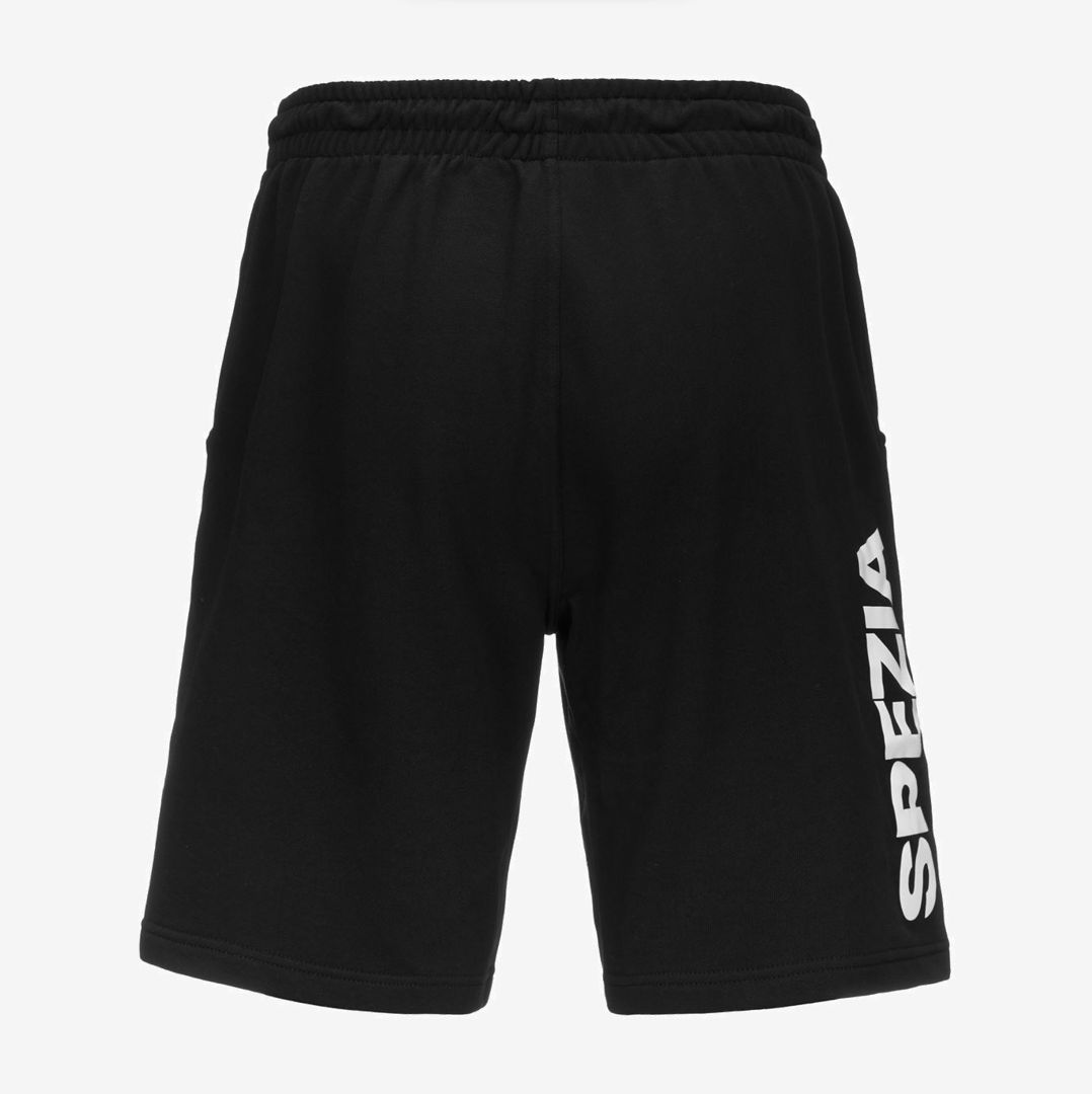 On the side of the bermuda is printed "Spezia" lettering, on the bottom of the left leg is embroidered Kappa logo and on the bottom of the right leg is embroidered Spezia Calcio logo.