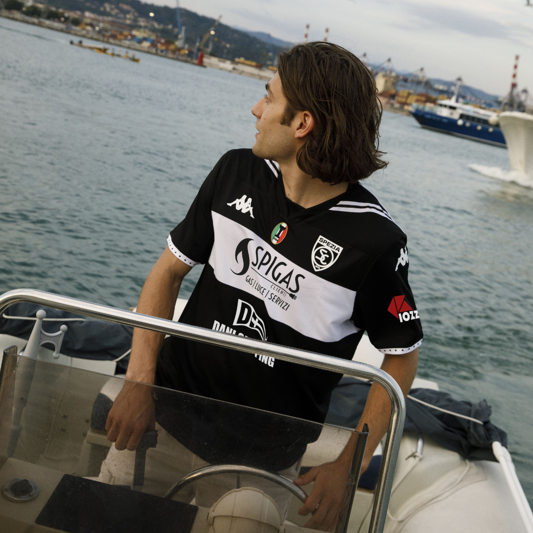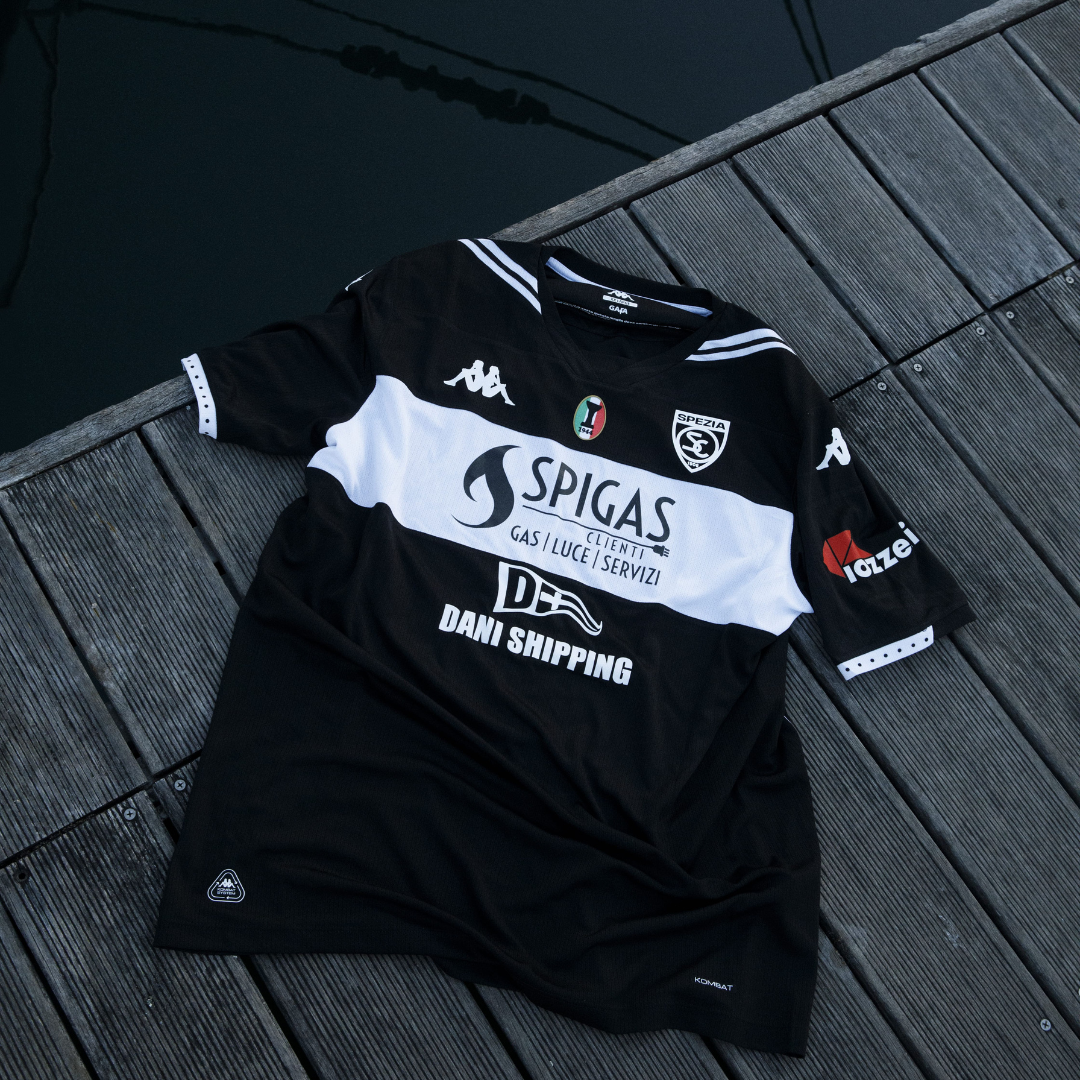 The 1944 shield, placed in the center of the chest and made of silicone, is a reference to the glorious past of the Club, while on the back and inside of the neck there is a lettering that is a symbol of belonging. To embellish the shirt in its entirety, the new logo of Spezia Calcio, also made of silicone, and the Kappa logo, hot applied on the chest and sleeves.